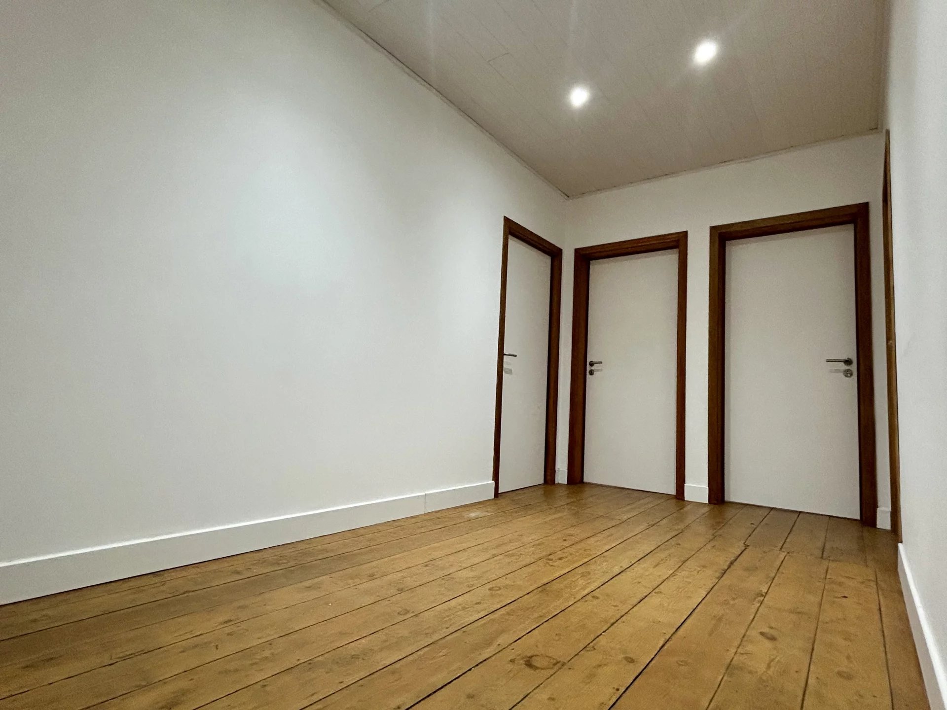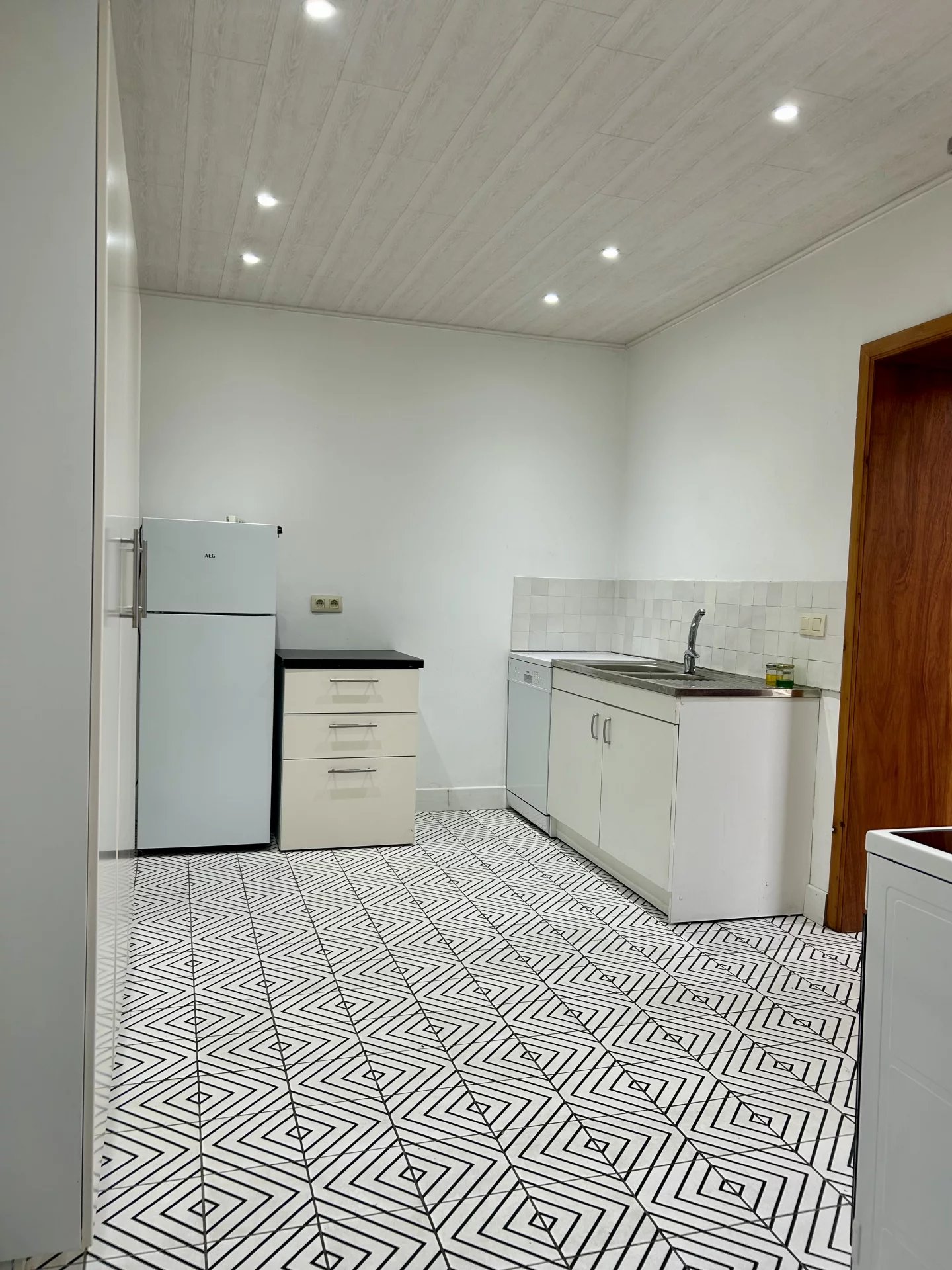Au rdc: grand séjour avec poêle aux pellets + espace de rangement pour le pellet, spacieux salon, cuisine, salle de douche et buanderie.